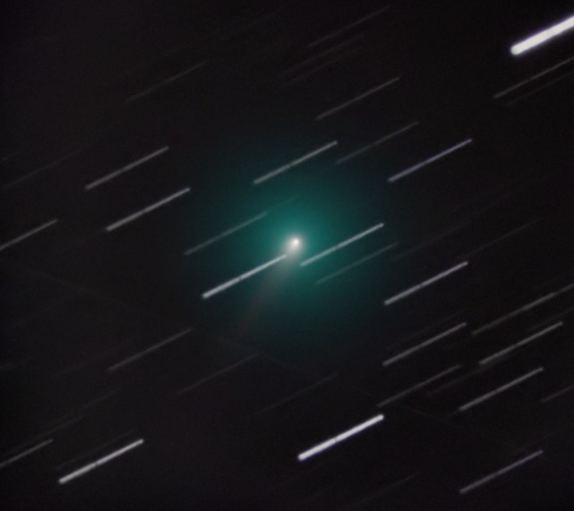 Lo spettro continuo è dovuto alla radiazione solare riflessa dalle particelle di polvere presenti nella chioma. Lo spettro in emissione – che mostra delle bande in emissione – è dovuto a un meccanismo di fluorescenza della radiazione solare con le molecole di OH, CN, C2, C3 e altre, presenti nella chioma. Queste molecole sono il risultato della scissione delle molecole progenitrici di cui sono composti gli elementi volatili del nucleo. L’intensità di queste componenti può essere debole, normale o forte in funzione dell’abbondanza presente. In alcuni casi eccezionali, il continuo o le bande di emissione possono essere assenti. Nella maggior parte degli spettri cometari, tolto il radicale OH che proviene dalla dissociazione delle molecole d’acqua sublimate dal nucleo, dominano le bande del CN, in altre invece le bande di Swan del C2. Le bande di Swan sono chiamate così in onore del fisico scozzese William Swan (1818-1894), il primo a studiare lo spettro della molecola di C2 nel 1856. Queste bande di emissione dominano lo spettro cometario fra 470 e 563,5 nm (nella regione ciano-verde del visibile) e sono quelle che conferiscono il caratteristico colore verde alla chioma delle comete. Al contrario, le bande del CN sono poste nel violetto dello spettro, nell’intorno dei 380 nm, mentre l’emissione dell’OH è nell’ultravioletto vicino attorno ai 309 nm. Il colore verde della chioma della Atlas e l’assenza del giallo (ossia della componente continua), ci dice che la cometa Atlas sta emettendo molto gas nello spazio ma poca polvere. Vedremo se questa caratteristica sarà mantenuta per tutto il passaggio o se – a un certo punto – anche l’emissione di polveri diventerà importante.