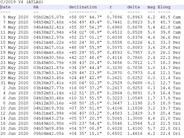 Purtroppo la cometa C/2019 Y4 sarà molto meno luminosa del previsto e probabilmente raggiungerà la soglia della visibilità a occhio nudo solo verso la fine di maggio 2020 quando sarà troppo vicino al Sole per essere osservata. Vedi la news: La cometa Atlas si indebolisce frammentandosi.