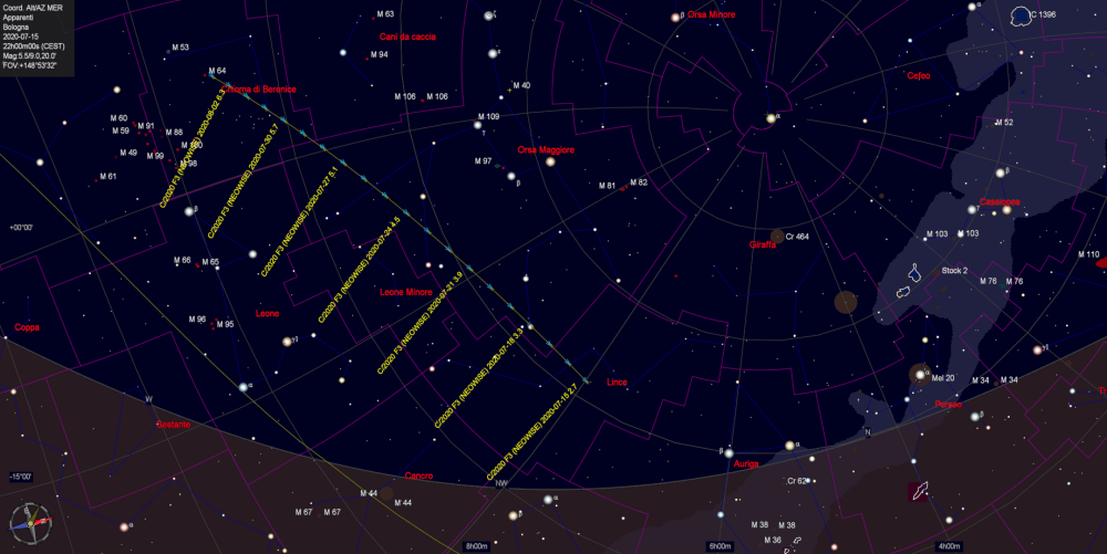 Dal 15 luglio la cometa sarà circumpolare per il nord Italia quindi può teoricamente essere osservata tutta la notte: alla sera sull’orizzonte di nord-ovest, a mezzanotte bassa sull’orizzonte nord e al mattino sull’orizzonte di nord-est. Chiaramente la visibilità serale rende superfluo fare l’alzata mattutina. Il periodo di visibilità circumpolare durerà fino al 23 luglio. Fra il 22 e il 23 luglio la Neowise si troverà alla minima distanza dalla Terra di 104 milioni di km, ma essendo già in fase di allontanamento dal Sole sarà osservabile come un astro di mag +4,5.