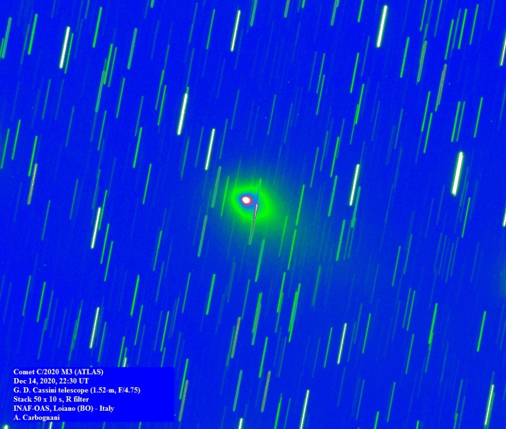 L’orbita eliocentrica della C/2020 M3 è inclinata di circa 23,5° sull’Eclittica, con una distanza del perielio abbastanza elevata: 1,27 AU. Il perielio è stato raggiunto il 25 ottobre 2020 e ora la cometa si sta allontanando sia dal Sole sia dalla Terra. Quindi, anche alla minima distanza dal Sole, la C/2020 M3 si è mantenuta a circa 190 milioni di km dalla nostra stella. In queste condizioni un tipico nucleo cometario arriva ad avere una temperatura superficiale di circa -16 °C: il ghiaccio d’acqua sublima perché ci si trova al di sotto della linea della neve e il nucleo sviluppa coma e coda anche se l’attività di perdita di volatili non è particolarmente intensa. Una situazione completamente diversa rispetto a quella di una cometa come la Neowise, che è passata a poche decine di milioni di km dalla fotosfera solare.