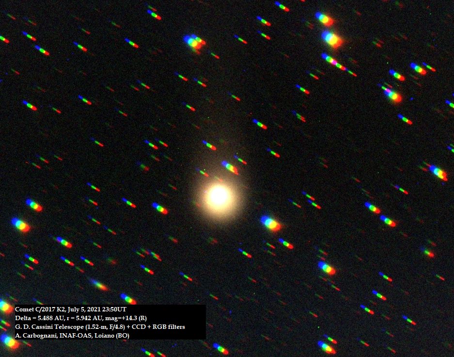 La prima cometa assolutamente da osservare è la C/2017 K2 (PANSTARRS). Si tratta di una cometa con orbita leggermente iperbolica ad alta inclinazione sull’Eclittica (ben 87.5°), che passerà al perielio il 20 dicembre 2022 a 1.8 AU dal Sole (circa 270 milioni di km dalla nostra stella). La cometa è stata scoperta il 21 maggio 2017 quando si trovava a 16 AU dal Sole con la chioma già formata. Al momento la cometa si trova a circa 5.9 AU dal Sole ed è molto attiva con una bella chioma tondeggiante di colore giallastro, probabilmente composta per lo più da polveri che riflettono la luce del Sole. Data l’orbita si tratta di una cometa dinamicamente nuova, proveniente direttamente dalla nube di Oort ai confini estremi del Sistema Solare e ricca di ghiacci super volatili, come la C/2010 U3. Il diametro apparente della chioma con il filtro Rc è di circa 1.5′ d’arco, equivalenti a 360.000 km nello spazio, mentre la magnitudine si assesta attorno alla +14.3: non è una cometa visibile a occhio nudo, ma un target interessante per piccoli telescopi dotati di camera CCD. Nei mesi di luglio e agosto 2021 la cometa sarà osservabile per tutta la notte nella costellazione di Ercole, quindi praticamente allo zenit per le medie latitudini italiane. Per ottenere le effemeridi precise con cui puntare il telescopio in cielo si può utilizzare il servizio effemeridi del Minor Planet Center.