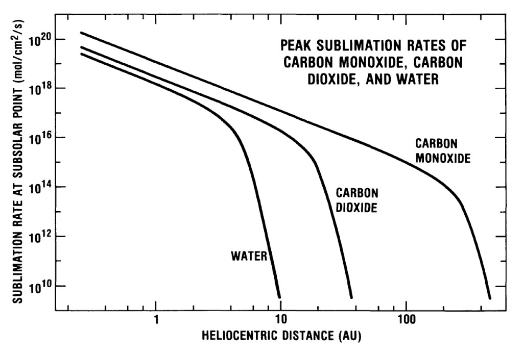 Di solito i nuclei cometari diventano completamente attivi, ossia emettono gas e polveri nello spazio, quando si trovano al di sotto della linea della neve che, nel Sistema Solare, vale circa 2.8 AU (420 milioni di km). A questa distanza eliocentrica un nucleo cometario raggiunge una temperatura superficiale di circa -100 °C, la sublimazione del ghiaccio d’acqua in superficie va a regime alimentando la chioma della cometa che raggiungerà dimensioni tipiche che vanno da 100.000 a 1.000.000 di km. Il tasso di sublimazione aumenterà fino a raggiungere un massimo attorno al perielio, per poi diminuire quando il nucleo si allontana dal Sole. Tuttavia esistono comete che sono attive ben oltre le 2.8 UA dal Sole perché ricche di elementi super volatili, fra queste le comete dinamicamente nuove (come la cometa C/2010 U3) perché, non essendosi mai trovate nei pressi del Sole, hanno la loro riserva di elementi volatili intatta. Oltre al ghiaccio d’acqua, nei nuclei cometari possono essere presenti i ghiacci del monossido di carbonio (CO) e biossido di carbonio (CO2). Questi ultimi hanno la proprietà di sublimare a temperature più basse rispetto al ghiaccio d’acqua. Il ghiaccio di biossido sublima fino a circa 10 AU, mentre quello di monossido arriva almeno fino a 25 AU, entrambi con un tasso paragonabile a quello dell’acqua a 2.8 AU (vedi Fig. 1). Fra le comete dinamicamente nuove ricche di elementi super volatili possiamo annoverare senz’altro la C/2017 K2, C/2019 K7 e C/2019 O3 che andiamo a vedere più in dettaglio.