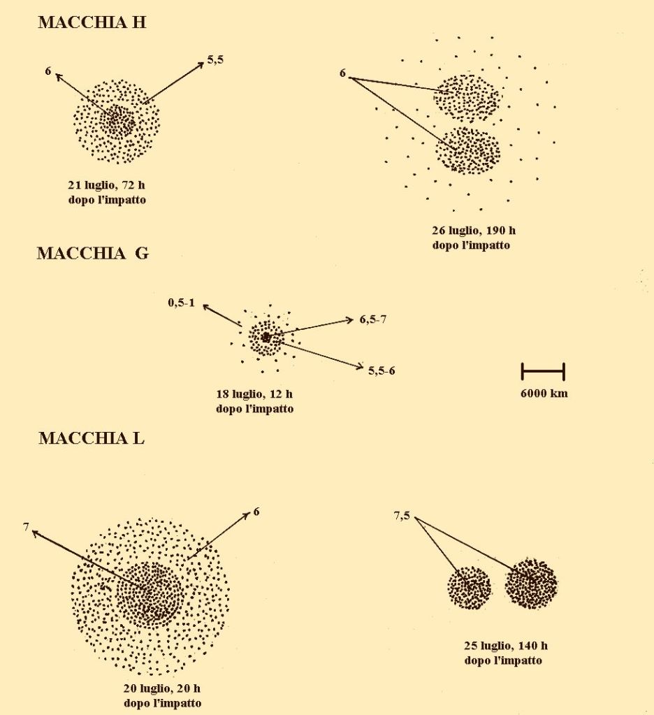Le macchie degli impatti si resero visibili entro poche ore dalla caduta, e già la sera del 17 luglio potei osservare le macchie A, C ed E: erano di colore molto scuro, circolari ma al loro interno non erano di intensità uniforme. Con il trascorrere dei giorni i nuclei scuri tendevano ad espandersi (stimai una velocità di espansione di circa 15-50 m/s), e attorno ad essi si rendevano visibili anelli più chiari. Le osservazioni furono rese difficili dalle condizioni meteo, spesso le nubi coprivano Giove e la turbolenza atmosferica elevata cancellava i dettagli più fini: bisognava pazientare per diversi minuti con l’occhio all’oculare del telescopio per riuscire a percepire quel dettaglio in più che poteva fare la differenza. In assenza della fotografia digitale, per stimare visualmente le dimensioni delle macchie si potevano usare come unità di misura le dimensioni delle ombre proiettate dai satelliti di Giove oppure lo spessore delle bande del pianeta, dei veri e propri tour de force per l’occhio, con osservazioni che andavano avanti per ore.