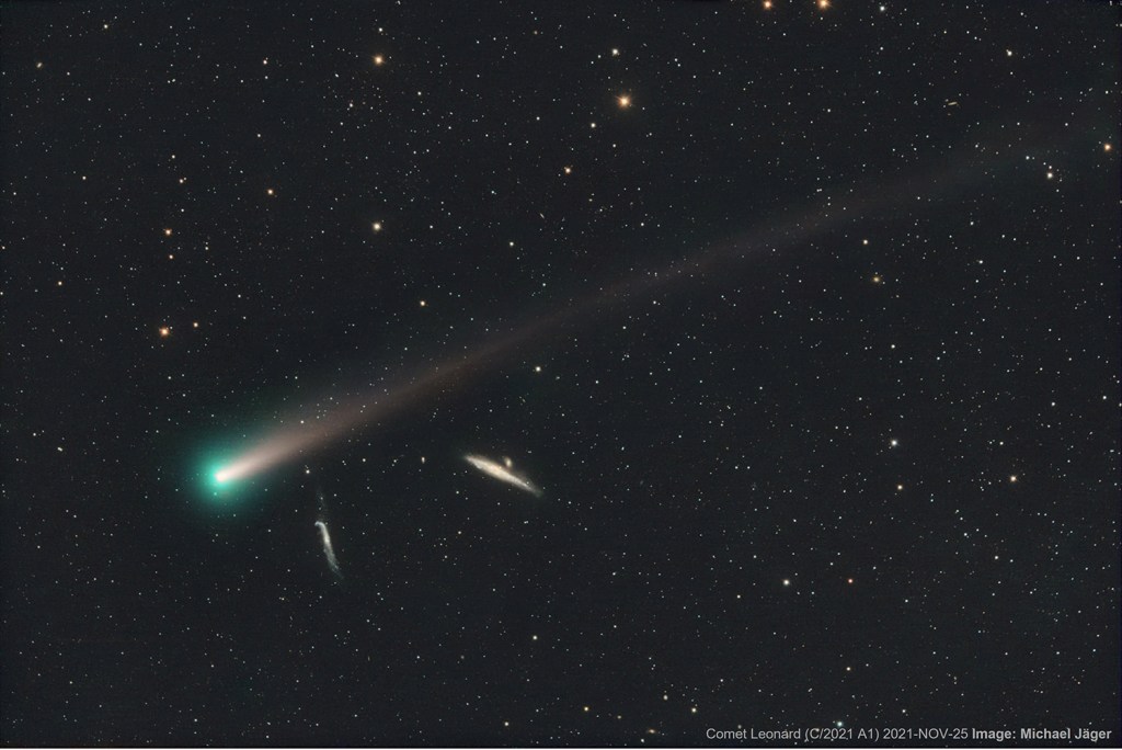 Il 3 gennaio 2021 Greg Leonard, usando il riflettore da 1,5 m di diametro posto sul monte Lemmon della Catalina Sky Survey, scopriva la cometa C/2021 A1 (Leonard) quando era ancora a circa 5 unità astronomiche dal Sole (pari a 750 milioni di km). L’averla scoperta così prematuramente è indice di una discreta attività del nucleo anche a grandi distanze dalla nostra stella, tipico delle comete ricche di materiali super-volatili. La Leonard percorre un’orbita eliocentrica al limite dell’iperbolico e probabilmente arriva direttamente dalla nube di Oort: l’orbita è retrograda con un’inclinazione di quasi 133° sul piano dell’eclittica. La cometa passerà al perielio il 3 gennaio 2022 arrivando fino a 92 milioni di km dal Sole: una distanza non troppo ridotta, quindi è molto probabile che il nucleo sopravviva al calore della nostra stella e ritorni indenne verso i confini del sistema solare. Però, ovviamente, le comete sono imprevedibili, quindi non è detta l’ultima parola e potrebbe verificarsi qualche fenomeno di frammentazione.