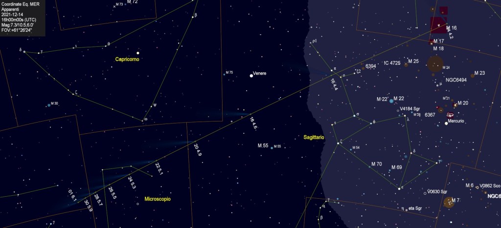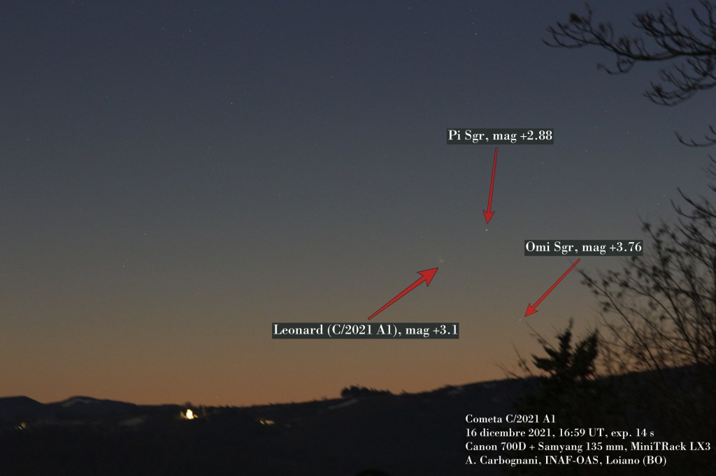Rispetto allo spettacolo offerto dalla brillante cometa Neowise (C/2020 F3) nel luglio 2020 la Leonard è una cometa “debole”, tuttavia è ben visibile con un piccolo binocolo o telescopio a patto di osservare da luoghi bui, lontano dalle luci cittadine. Per quanto ci riguarda una cometa come ce ne sono tante, ma l’orbita che percorre la Leonard è tale per cui il 18 dicembre 2021 alle 02:08 UT la porterà a passare a soli 4,3 milioni di km da Venere, il brillante pianeta che in questi mesi è ben visibile a occhio nudo a ovest, subito dopo il tramonto del Sole. La sera del 18 dicembre la Leonard e Venere saranno osservabili nella stessa zona di cielo, la costellazione del Sagittario, a soli 5,5° di distanza angolare: più in alto Venere ed esattamente sotto, la cometa. Purtroppo la Leonard per l’Italia tramonterà alle 18:20 locali, all’inizio della notte astronomica, quindi occorrerà cercarla (o fotografarla assieme a Venere), prima che sia troppo bassa sull’orizzonte con il cielo ancora chiaro: una bella sfida.