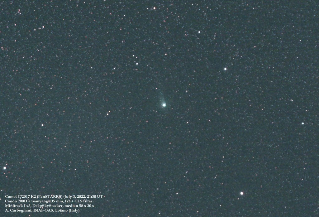Molto di voi ricorderanno la brillante cometa Neowise (C/2020 F3), che nel luglio 2020 diede spettacolo all’alba e al tramonto superando la soglia della visibilità a occhio nudo. L’estate 2022 sarà un buon periodo per l’osservazione di una cometa molto particolare: la C/2017 K2 (PanSTARRS). Anche se non supererà la soglia della visibilità a occhio nudo sarà alla minima distanza dalla Terra il 14 luglio 2022 e basterà un buon binocolo per poterla osservare nel cielo estivo di sud-ovest in prima serata, appena fa buio. Un’occasione da non perdere prima che diventi un oggetto troppo australe e riprenda il viaggio verso i confini del Sistema Solare.