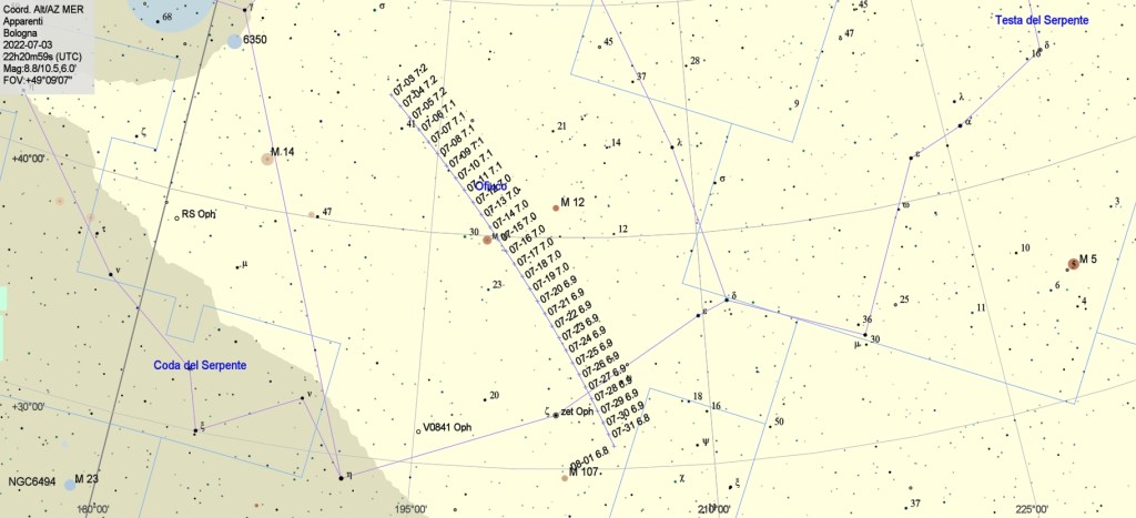 La C/2017 K2 ha impiegato milioni di anni per percorrere la distanza che ci separa dalla nube di Oort e fra pochi giorni, il 14 luglio 2022, sarà alla minima distanza dalla Terra di 1,8 au. La magnitudine prevista è attorno alla +7, quindi basterà un piccolo binocolo per poterla vedere in cielo nel mezzo della costellazione di Ofiuco a sud, a circa 45° di altezza sull’orizzonte, appena cala la notte. Al mattino del 15 luglio la cometa si proietterà prospetticamente fra gli ammassi globulari M10 e M12, una ghiotta occasione per gli astrofotografi. Dopo il 14 luglio la distanza geocentrica della cometa aumenterà, ma visto che continuerà ad avvicinarsi al Sole la cometa diventerà un po’ più luminosa fin verso metà settembre 2022 quando sarà difficile da osservare perché oramai in congiunzione con il Sole. Inoltre avrà una declinazione piuttosto bassa di -27° che ne renderà difficile l’osservazione dalle medie latitudini settentrionali. A questa data sarà di magnitudine +6,6 quindi quasi al limite della visibilità a occhio nudo. Il perielio ossia la minima distanza dalla nostra stella verrà raggiunto alle 21:50 UT del 19 dicembre 2022 con la cometa a 37° di elongazione dal Sole. Tuttavia il perielio sarà “alto” a 1,798 au dal Sole e con la cometa a 2,5 au dalla Terra quindi la C/2017 K2 rimarrà di magnitudine apparente +6. Purtroppo avrà una declinazione di circa -60°, quindi sarà un oggetto del cielo australe non osservabile dall’Italia. Dopo il 19 dicembre la C/2017 K2 riprenderà ad allontanarsi dal Sole, iniziando il lungo viaggio di ritorno verso la nube di Oort.