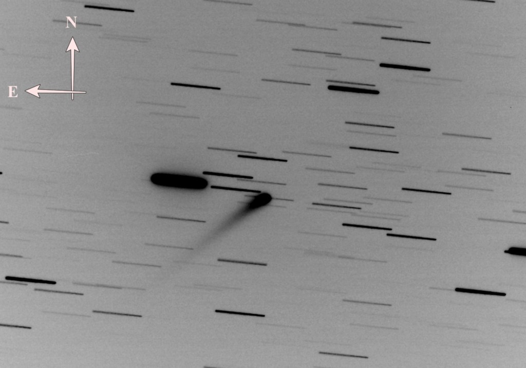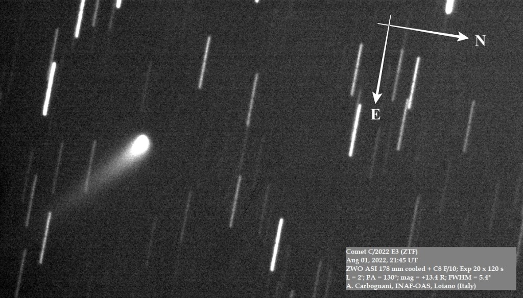 La cometa ZTF con la chioma e la coda di polveri ripresa nella notte del 1 agosto 2022 da Loiano (B0), quando era a 2,1 au dalla Terra e 2,6 au dal Sole. Il diametro della chioma è stimabile in circa 6 secondi d’arco, pari a circa 10.000 km nello spazio (Crediti: A. Carbognani).