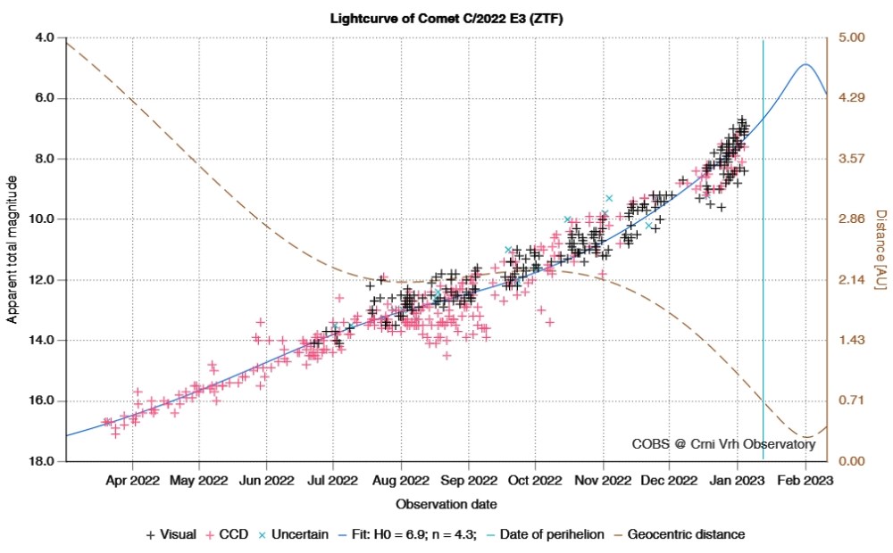 La magnitudine apparente della cometa ZTF prevista in base alle misure attuali di luminosità (curva blu). Come si vede il picco sarà raggiunto il 1 febbraio 2023 in corrispondenza della minima distanza dalla Terra. La linea tratteggiata è la distanza geocentrica, quella con i puntini la distanza eliocentrica (Crediti: COBS).