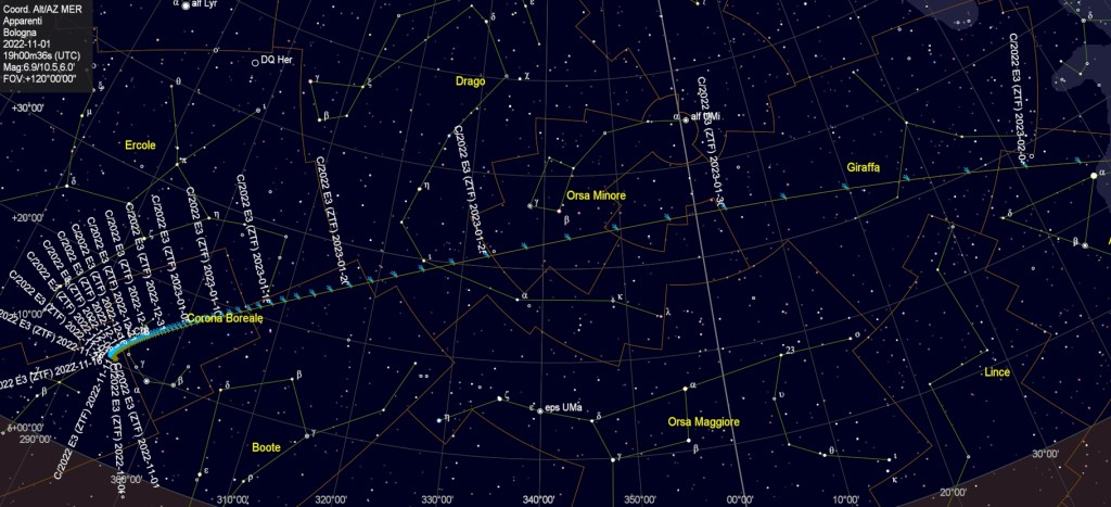 Il percorso in cielo della cometa C/2022 E3 (ZTF) dal 1 novembre 2022 al 4 febbraio 2023 (Crediti: A. Carbognani/Sky Chart).