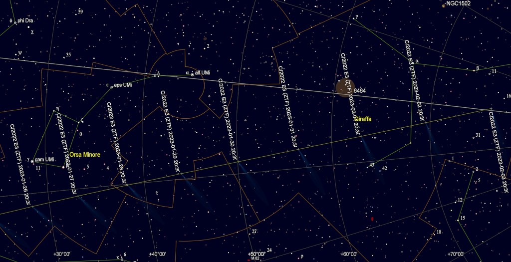 Il percorso in cielo della cometa C/2022 E3 (ZTF) dal 26 gennaio al 3 febbraio 2023, nel periodo di visibilità a occhio nudo. Come si vede fra il 29 e il 30 gennaio la cometa transiterà prospetticamente vicina alla stella Polare (Crediti: A. Carbognani/Sky Chart).