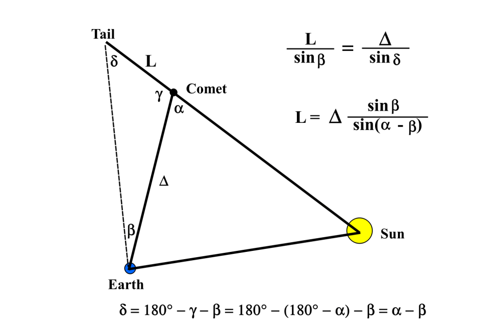 In immagini riprese la sera del 16 agosto 2022 questa cometa mostrava una coda di polveri della lunghezza di circa 4 primi d’arco ossia 0,067°. La misura della lunghezza è stata fatta con il software Astrometrica, che ha la possibilità di mostrare la distanza fra due punti arbitrari dell’immagine. A quanto equivale nello spazio l’angolo sotteso dalla coda? Supponiamo che la coda sia ortogonale alla linea di vista, non è vero ma è un primo passo verso la soluzione. Dalle effemeridi sappiamo che la cometa era a circa 2,135 au = 319,4 milioni di km dalla Terra, quindi se la coda sottendeva 0,067° doveva avere almeno una lunghezza L = 319,4 * (0,067°/57,29°) = 370.000 km. In questo calcolo approssimato abbiamo sfruttato il fatto che, se l’angolo sotteso è piccolo, la tangente dell’angolo è praticamente uguale all’angolo stesso espresso in radianti (57,29° è la misura in gradi di un radiante). Questo è solo un limite inferiore, in realtà la geometria con cui abbiamo a che fare è quella della Fig. 2. Qui siamo nel piano identificato da tre corpi: il nucleo cometario, la Terra e il Sole. Delta è la distanza Terra-cometa, mentre alfa è l’angolo di fase ossia l’angolo Terra-cometa-Sole. Infine beta è l’angolo sotteso dalla coda osservata dalla Terra. Siamo nel caso di una geometria piana, quindi si può applicare il teorema dei Seni al triangolo Tail-Comet-Earth per ricavare L, la lunghezza della coda. La formula per L che si trova è riportata direttamente nella Fig. 2. Applicandola al nostro caso tenendo conto che, dalle effemeridi, alfa = 24,2° si trova L = 913.000 km ossia arrotondando, circa 1 milione di km. In conclusione la lunghezza reale della coda della cometa C/2022 E3 nello spazio è quasi 3 volte quella che si otterrebbe dalla semplice ipotesi di ortogonalità alla linea di vista. Ricordiamolo la prossima volta che ci sarà da stimare la lunghezza della coda di una cometa.