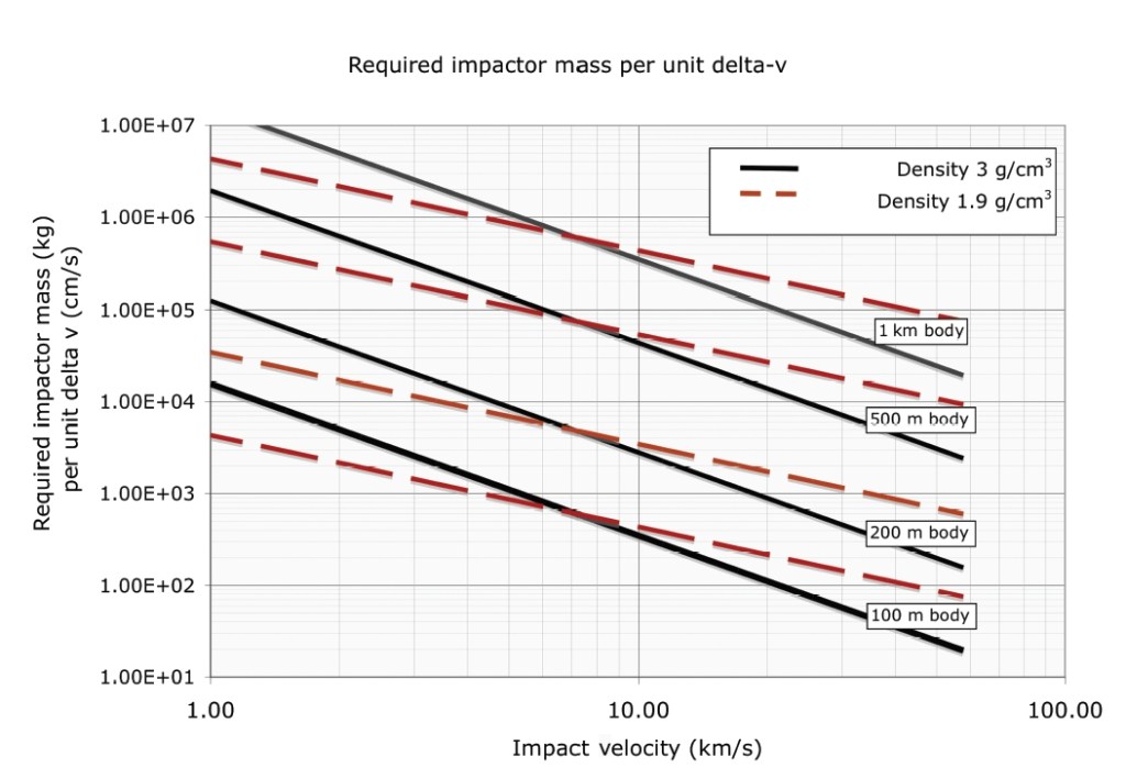 Dove m e M sono, rispettivamente, le masse dell’impattore e del NEO, U è la velocità relativa infine il fattore β, che tiene conto degli ejecta espulsi nella formazione del cratere, che sarà maggiore o uguale all’unità. Questa equazione, ipotizzando il valore di β può essere utilizzata per determinare la massa di una sonda necessaria per modificare la velocità di un NEO di 1 cm/s in funzione del diametro e della velocità relativa, come mostrato in Fig. 2. La massa richiesta per la sonda aumenta al diminuire del tempo di collisione con la Terra perché la velocità del NEO va cambiata di una quantità sempre più grande considerato che il tempo per la propagazione del cambiamento della posizione nello spazio diminuisce.