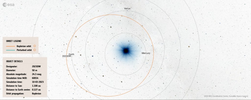 In seguito all’aumento del numero delle osservazioni astrometriche e al conseguente aumento dell’arco orbitale osservato (che attualmente è di 20 giorni), 2023 DW è uscito dalla risk list dell’ESA. Il 14 febbraio 2046 alle 13:21 UT l’asteroide farà solo un passaggio ravvicinato con la Terra ad una distanza compresa fra 715.500 km e 8.358.000 km. Per male che vada passerà a una distanza minima pari a circa 2 volte la distanza Terra-Luna e sarà del tutto innocuo.