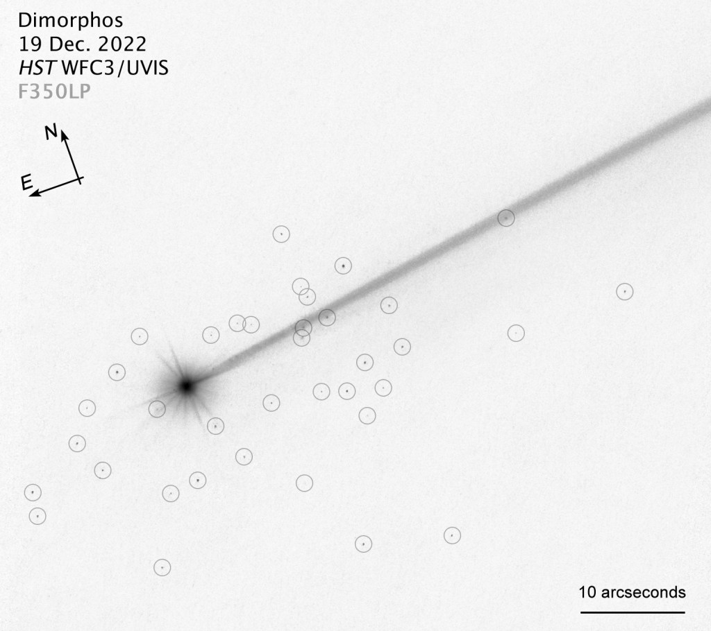 In questa news vogliamo parlare dei risultati delle osservazioni fatte con il telescopio spaziale Hubble, che si trova in orbita bassa attorno alla Terra dal 1990, sul sistema Didymos + Dimorphos nei mesi successivi all’impatto: il 19 dicembre 2022, il 4 febbraio 2023 e il 10 aprile 2023. Nell’immagine del 19 dicembre, che vi mostriamo sotto in negativo per facilitare la visione, è presente una popolazione di oggetti – indicata dai cerchietti – che non era mai stata osservata prima d’ora: si tratta di 37 massi espulsi durante la collisione di DART con Dimorphos, ancora presenti nello spazio attorno al sistema binario.