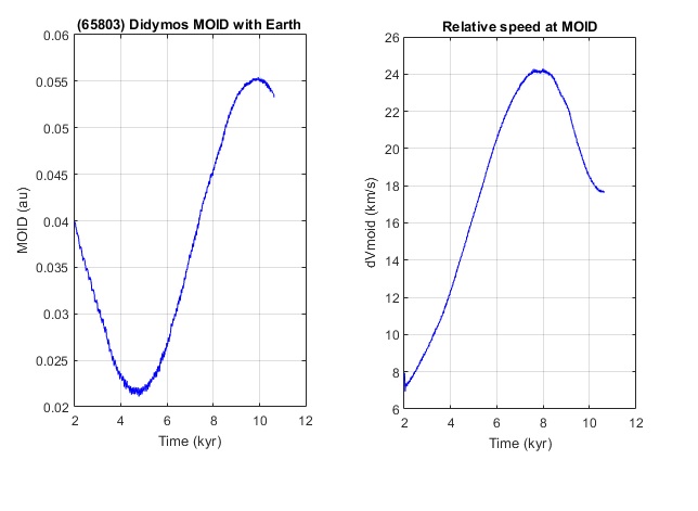 Come si può vedere la MOID dell’orbita di Didymos con la Terra tenderà a diminuire nei prossimi secoli, raggiungendo un minimo di 0,021 au fra circa 4900 anni. Poi tornerà a salire per raggiungere un massimo di 0,055 au fra circa 10.000 anni. Considerata questa evoluzione, per la nube di boulder in espansione sarà più facile colpire la Terra perché la MOID nel frattempo diminuirà ed è ragionevole attendersi che anche per i massi valga la stessa cosa visto che si muovono su orbite molto simili a quella di Didymos.