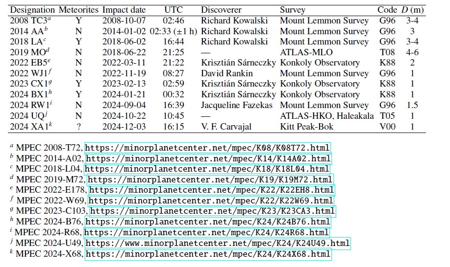 E siamo a 11 piccoli asteroidi scoperti poche ore prima di cadere sulla Terra. Nel 2024 sono stati già 4 gli impatti previsti: 2024 BX1 il 21 gennaio, 2024 RW1 il 4 settembre, 2024 UQ il 22 ottobre e 2024 AX1 il 3 dicembre (vedi Tabella). In questa news parliamo di quest’ultimo evento, ma dalla tabella risulta che il 2024 è l’anno con il maggior numero di impatti previsti di sempre, superando il 2018 e il 2022 che avevano il primato, a pari merito, con 2 eventi ciascuno.