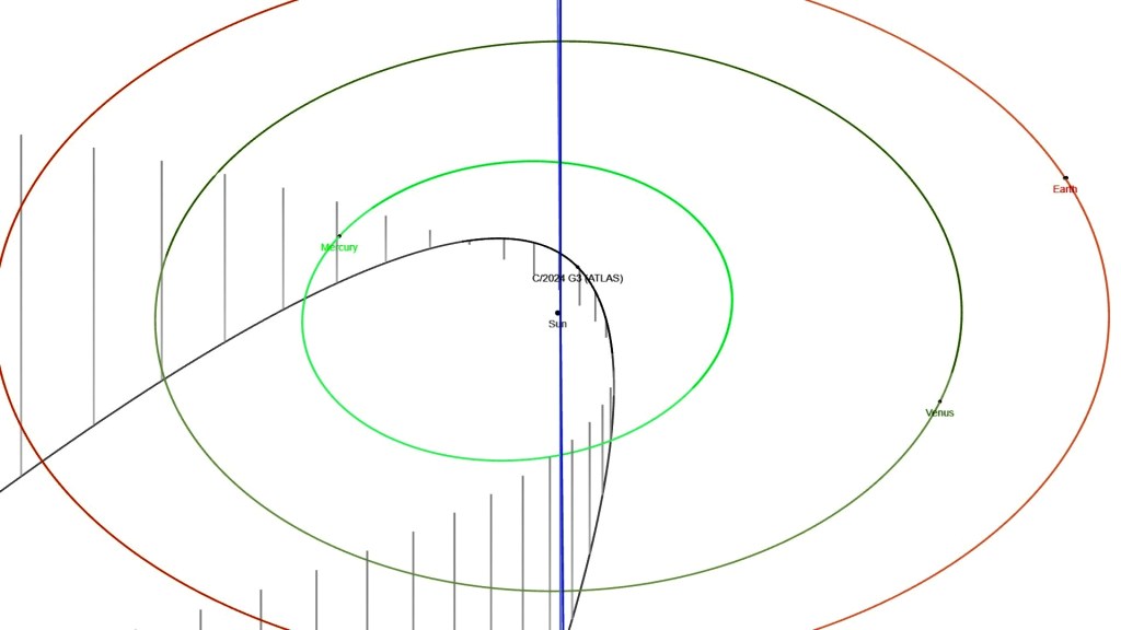 L’inclinazione del piano orbitale della ATLAS sull’eclittica è di circa 116° il che significa che l’orbita è retrograda, ossia che la cometa si muove in senso orario se vista dal polo nord dell’eclittica: in senso contrario a quello dei pianeti e della maggior parte dei corpi del Sistema Solare. Non solo l’orbita è retrograda, ma si svolge per la maggior parte al di sotto del piano dell’eclittica, con solo il passaggio al perielio al di sopra. Quest’orbita implica che la recente traiettoria descritta in cielo della C/2024 G3 è sempre stata caratterizzata da declinazioni fortemente negative, che ne hanno precluso l’osservabilità dall’emisfero settentrionale, favorendo invece quello meridionale. Il perielio della ATLAS si trova a 0,093 ua dal Sole (circa 14 milioni di km), tutto sommato un valore non estremo per una sungrazing e il nucleo della cometa dovrebbe sopravvivere indenne al passaggio ravvicinato con la nostra stella.