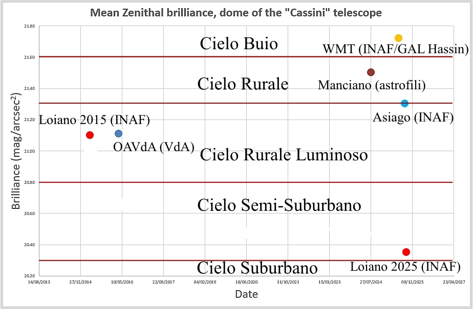 Lavorando alla Stazione Astronomica, ho avuto occasione di “spulciare” fra i vecchi registri delle osservazioni ritrovando casualmente delle misure di brillanza (o luminosità) del fondo cielo fatte nell’aprile 2015 con lo Sky Quality Meter-L dalla cupola del “Cassini”. Ne ho quindi approfittato e usato il mio SQM-L, acquistato nel 2025, per fare nuove misure di brillanza allo zenit con un cielo molto trasparente e senza Luna. Come confronto ho recuperato una serie di misure di brillanza zenitale in notti trasparenti e senza Luna che avevo fatto nel periodo 2015-2016, sempre con lo SQM-L, quando lavoravo all’Osservatorio Astronomico della Valle d’Aosta più un’altra serie di misure recenti fra cui quella della brillanza del cielo all’osservatorio astrofisico di Asiago (Cime Ekar).