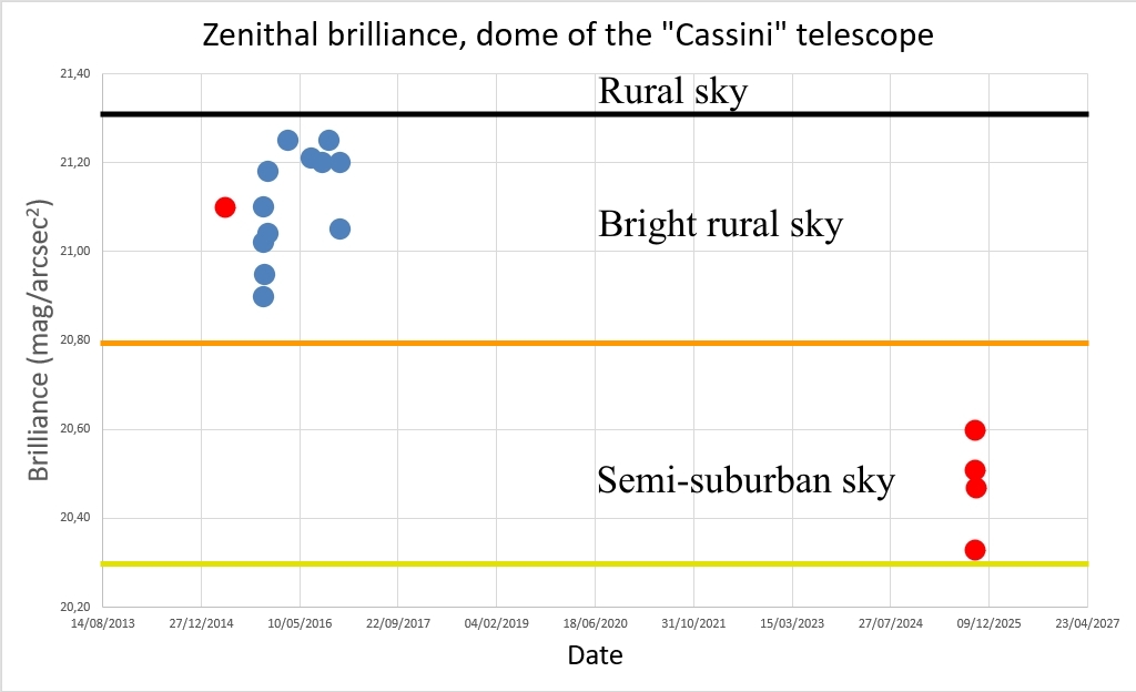 Lavorando alla Stazione Astronomica, ho avuto occasione di spulciare fra i vecchi registri delle osservazioni ritrovando casualmente delle misure di brillanza (o luminosità) del fondo cielo fatte nell’aprile 2015 con lo Sky Quality Meter-L dalla cupola del “Cassini”. Ne ho quindi approfittato e usato il mio SQM-L, acquistato di recente, per fare nuove misure di brillanza allo zenit con un cielo molto trasparente e senza Luna. Come confronto ho recuperato una serie di misure di brillanza zenitale in notti trasparenti e senza Luna che avevo fatto nel periodo 2015-2016, sempre con lo SQM-L, quando lavoravo all’Osservatorio Astronomico della Valle d’Aosta.
