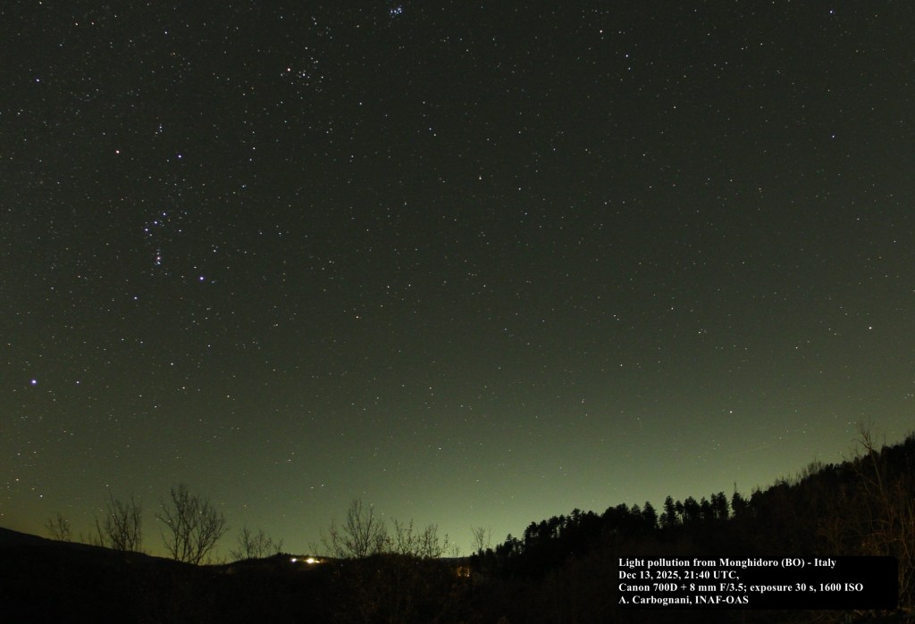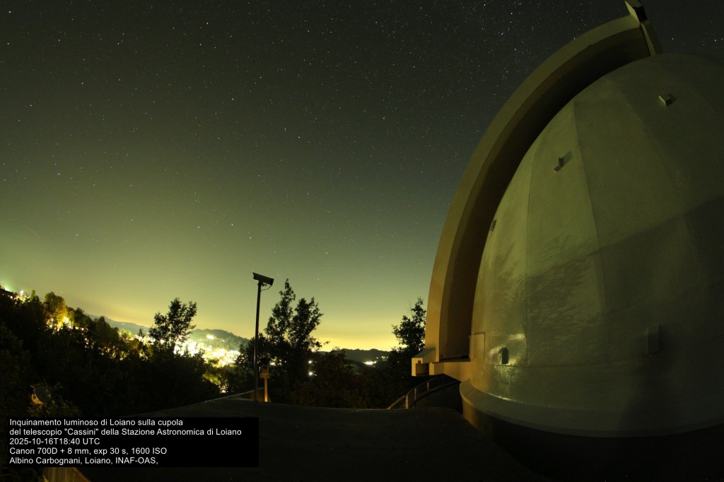 Anche il Comune di Loiano, che si trova a 750 metri di quota sull’Appennino bolognese, pare non sfugga a questa logica. Nel 2024 c’è stato il passaggio dell’illuminazione pubblica dal sodio ai LED e la situazione dell’inquinamento luminoso è peggiorata. Questo nonostante Loiano ospiti la Stazione Astronomica di Loiano gestita dall’Istituto Nazionale di Astrofisica – Osservatorio di Astrofisica e Scienza dello Spazio di Bologna. La Stazione Astronomica, che si trova a circa 1,5 km dal centro del paese, possiede il telescopio “G. D. Cassini”, il secondo strumento come diametro presente sul territorio nazionale, e l’innovativo sistema TANDEM per la sorveglianza spaziale di satelliti e space debris. In teoria la Stazione Astronomica, essendo una struttura professionale, dovrebbe godere di una zona di protezione di 25 km di raggio, nella realtà però le cose non stanno così.