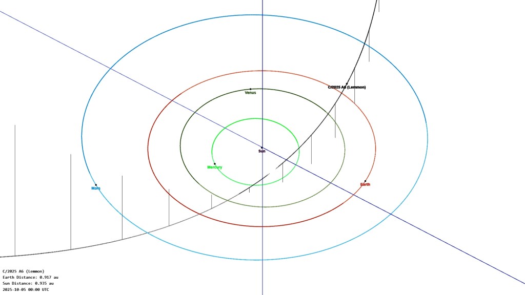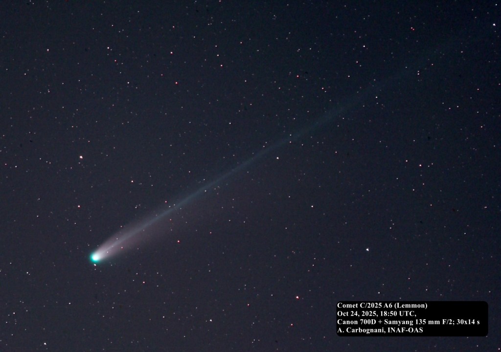 La cometa Lemmon (C/2025 A6) è stata scoperta il 3 gennaio 2025 dal telescopio di 1,5 metri di diametro della Mount Lemmon Survey, che si trova a nord-est di Tucson in Arizona. Al momento della scoperta la cometa brillava di magnitudine +21,6 ed era a circa 4,4 au dal Sole e 3,4 au dalla Terra. Dopo la conferma da parte di altri osservatori, la scoperta è stata annunciata dal Minor Planet Center con la MPEC 2025-D55 : COMET C/2025 A6 (Lemmon). L’orbita eliocentrica di questa cometa ha un semiasse maggiore di 122 au, un’eccentricità di 0,9956 con un’inclinazione di ben 143,7° sul piano dell’eclittica. In base alla Terza legge di Keplero il periodo orbitale di questa cometa risulta di circa 1347 anni, con perielio a 122*(1-0,9956)=0,53 au ed afelio a 122*(1+0,9956)=243 au. In pratica la Lemmon ha il perielio poco oltre l’orbita di Mercurio, l’afelio ben oltre la fascia di Kuiper e si muove su un’orbita retrograda, ossia si sposta in senso antiorario se vista dal polo nord dell’eclittica.