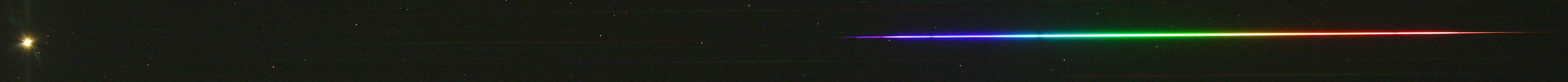 La Fig. 1 è un crop dell’immagine originale acquisita nel formato raw della DSLR e successivamente convertita in TIFF (Tagged Image File Format), per evitare le compressioni a perdita di dati tipiche del formato JPEG. A sinistra si vede l’ordine zero, ossia la stella Sirio, e a destra lo spettro più brillante dell’ordine 1. Se si guarda con attenzione, si noteranno righe scure che si sovrappongono al fondo continuo; sono le righe di assorbimento della serie di Balmer. Le più intense sono la H-beta nell’azzurro (a 486,1 nm) e la H-delta nel viola a 410,2 nm. La H-alpha nel rosso, a 656,3 nm, è visibile, ma con maggiore difficoltà. Prima di analizzarla, l’immagine andrà corretta con i master dark e flat.
