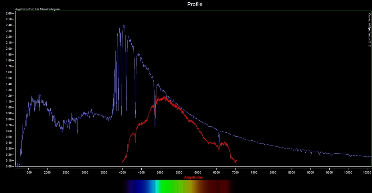 Che sia così, possiamo rendercene conto plottando lo spettro di una stella A2V tratta dalla libreria spettri di RSpec. Gli spettri di questa libreria sono normalizzati all’intensità 1 a 5500 Å. Per normalizzare a uno anche il nostro spettro di Sirio, bisogna muoversi con il mouse sullo spettro per leggere l’intensità in corrispondenza di 5500 Å; nel nostro caso, risulta pari a 2460 ADU. Andando sul pulsante “Reference -> Math“, si potrà dividere il “Main Profile” (ossia lo spettro di Sirio che compare nella finestra “Profile”) per questo valore e trasferire questo nuovo spettro normalizzato cliccando sul pulsante “Move to Main Profile“. Per il plot dello spettro di riferimento si usa il pulsante “Profile -> Open Reference Series“. In questo modo si può accedere alla libreria di spettri normalizzati e corretti sia per l’atmosfera sia per la risposta strumentale. Per un confronto con Sirio si può caricare il file di testo a2v.dat (a1v.dat non c’è), che comparirà come un profilo di riferimento azzurro, così da distinguerlo dal “Main Profile” rosso. Il risultato è mostrato in Fig. 4: la differenza fra il “Main Profile” e il “Reference” è evidente. Come fare per compensare lo scattering Rayleigh e ottenere la curva di risposta strumentale? Continua.