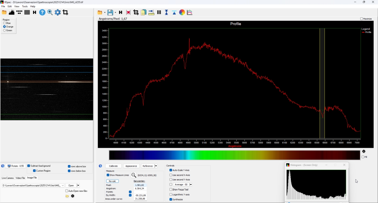 Come software per l’analisi degli spettri ho scelto RSpec, di Tom Field. Pur essendo a pagamento, si tratta di un software flessibile e relativamente facile da utilizzare, anche se il manuale di utilizzo consiste in una serie di video e non nel classico documento pdf, come sarebbe stato preferibile. L’alternativa gratuita a RSpec è VisualSpec di Valerie Desnoux, che però ha una curva d’apprendimento più ripida rispetto a RSpec. In questo approfondimento vedremo anche quali sono i comandi principali di RSpec; con un po’ di pratica, l’uso diventerà intuitivo. Qualunque sia il software adottato, il compito principale è ottenere il grafico dell’intensità in funzione della lunghezza d’onda dello spettro, così da consentire la calibrazione in lunghezza d’onda, la correzione della risposta strumentale, l’eventuale sottrazione del continuo se si vogliono solo le righe (di assorbimento o di emissione), la misura dell’area delle righe e così via.